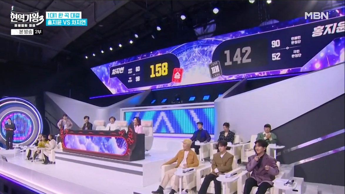 1라운드는 하춘화·정수라·주현미. 활동 연차 도합 152년에 달하는 레전드 가수들의 곡으로 맞붙는 ‘마녀사냥2’ 방식으로 진행됐고, 원곡자에게 선택을 모두 받으면 추가 점수까지 주어졌습니다.